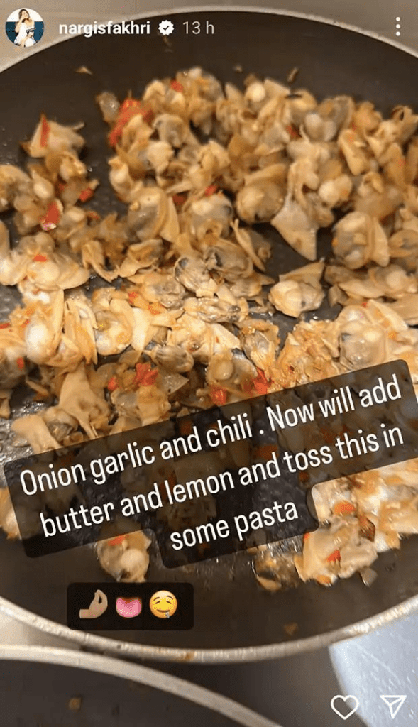 In one of the photos, Nargis captured the beginning of her cooking process, where she sautéed onion, garlic, and chili in a pan. She then added butter and lemon to the mixture and tossed it all with some pasta. In the next photo, she shared a glimpse of the boiled spaghetti, which was almost ready to be mixed with the sauce and other ingredients. She excitedly wrote, “Get that pasta ready!” with the hashtag, #Pasta.